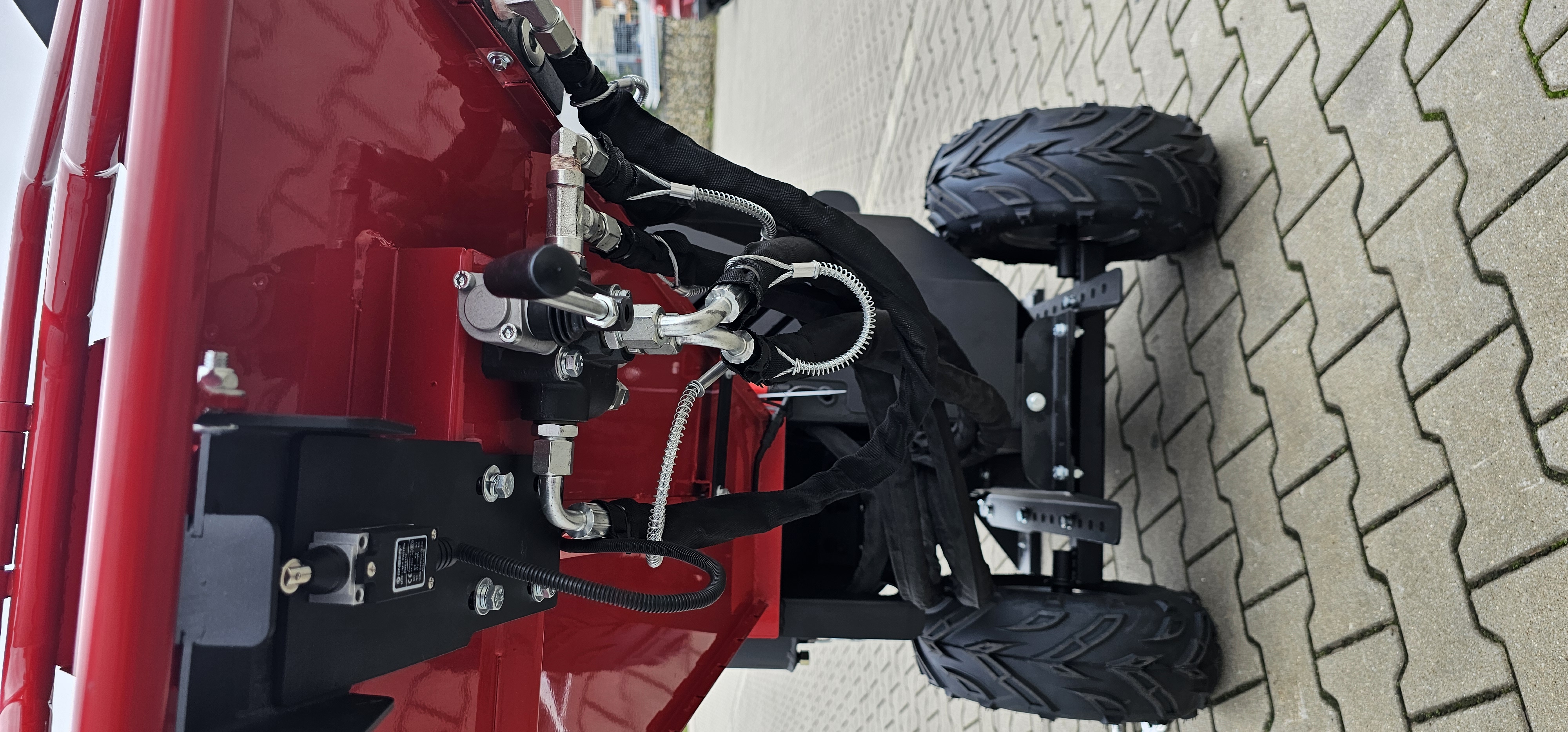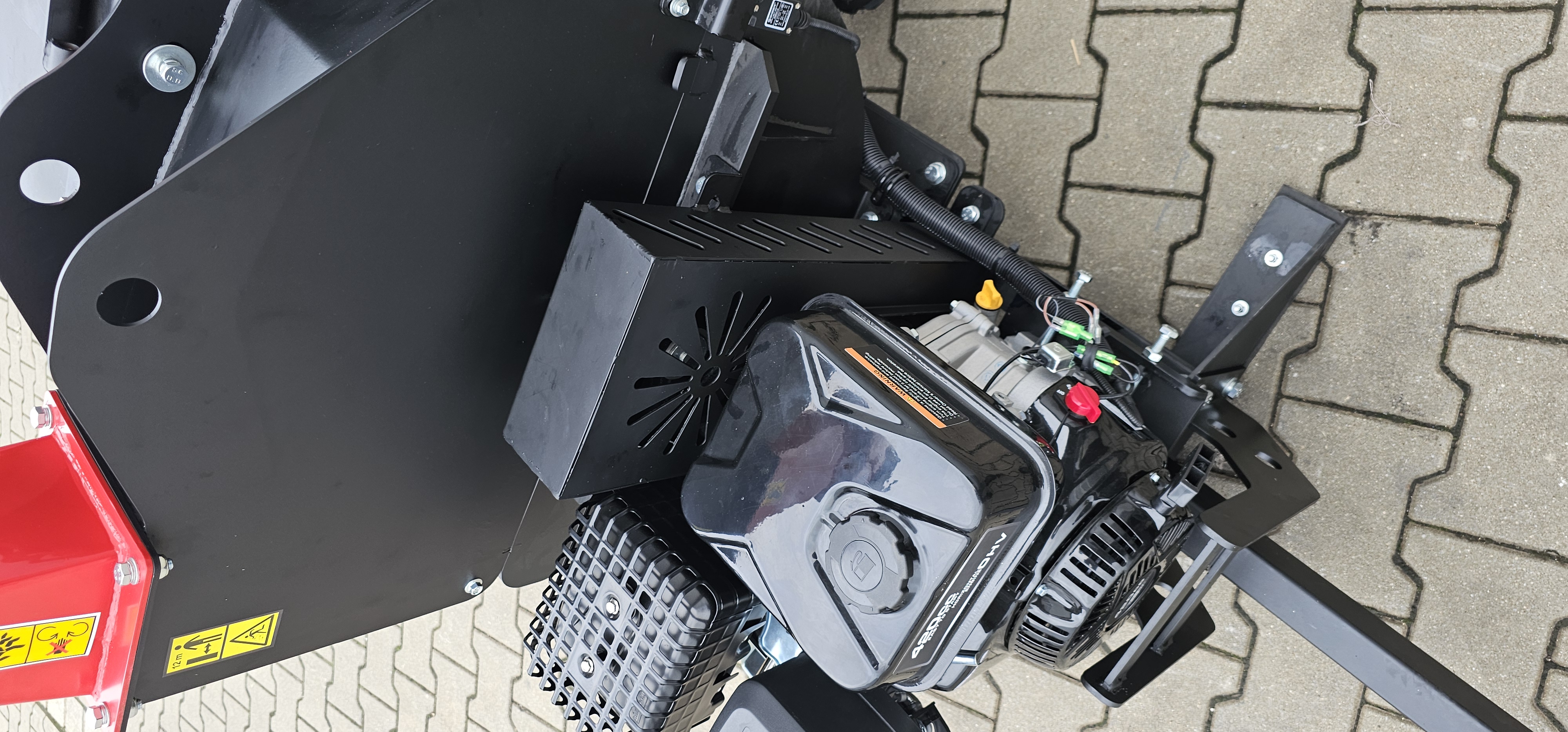 der zur Seite geklappt werden kann, um so leichter Wartungsarbeiten an Rotor und Messern durchführen zu können. Der Einfülltrichter ist mit einem Not-Aus-Schalter ausgestattet. Der Auswurftrichter kann gedreht werden und auch die Auswurfklappe ist verstellbar. Die Reifen mit Stollen-Luftbereifung für schnelles, einfaches Umsetzen auch in unwegsamen Gelände. Der Häcksler ist mit einer 50mm-Anhängerkupplung ausgestattet. Die Häcksler können Lackschäden aufweisen!